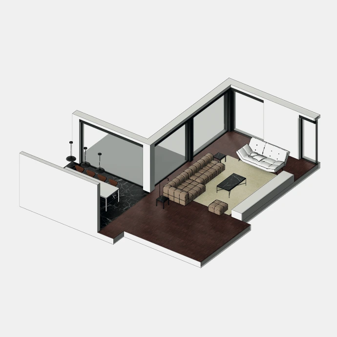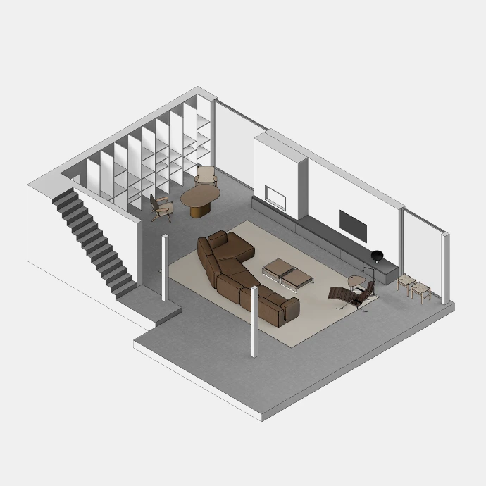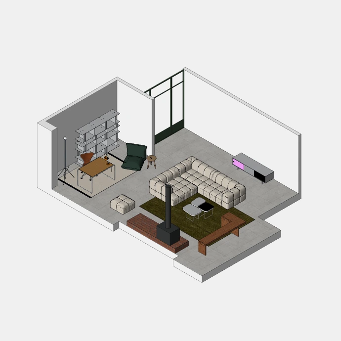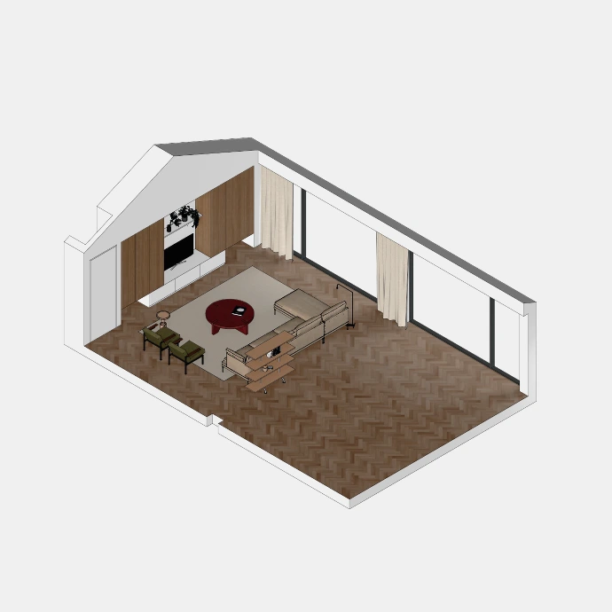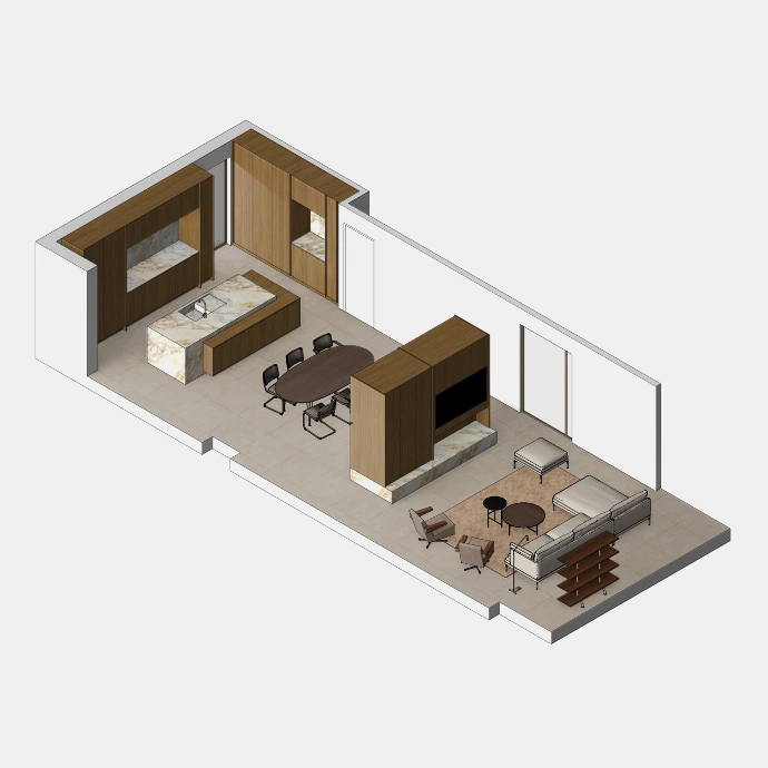 Per project wordt een volledig interieur opgebouwd op basis van de architectuur van de eindklant. Alle meubelstukken, objecten en decoratieve elementen worden zorgvuldig gemodelleerd, op schaal geplaatst en voorzien van realistische materiaalstudies, zodat een coherent totaalbeeld ontstaat nog vóór de realisatie. Dergelijke visualisaties maken het mogelijk om inrichting, maatvoering en materialisatie helder te toetsen binnen de toekomstige ruimte.