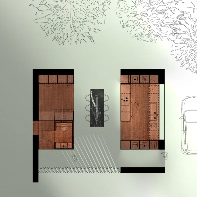 De aanbouw wordt georganiseerd door twee dense volumes — een doorgroeiruimte en een compacte kookzone — die de open ruimte structureren en richting geven aan circulatie, zicht en licht. Tussen deze blokken ontstaat een heldere gebouwschil waarin beweging de verbindende factor vormt en sociale interactie vanzelfsprekend wordt.