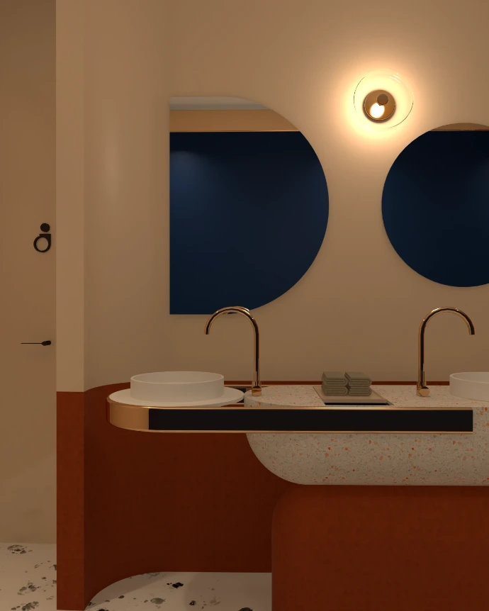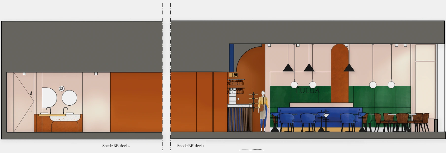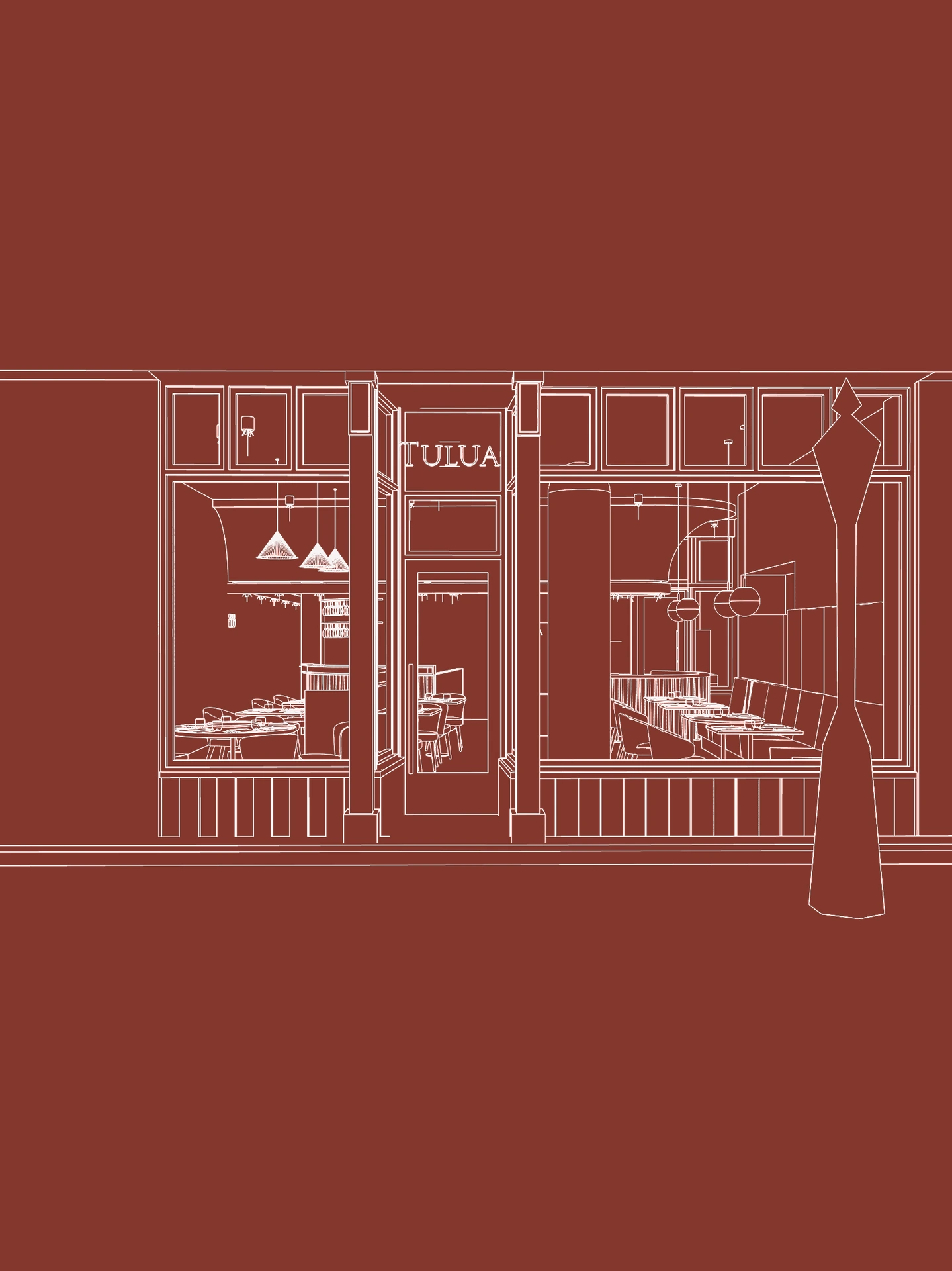 Twee krachtige basislijnen sturen het ontwerp. Enerzijds is er de schuinte, ontstaan vanuit de vitrine, die de verhoudingen van het pand benadrukt en een gevoel van beweging en dynamiek introduceert. Anderzijds vormt een centrale ronding het ruimtelijke anker: een bijna totemisch element dat het hart van Tulua symboliseert en de verschillende functies met elkaar verbindt.
