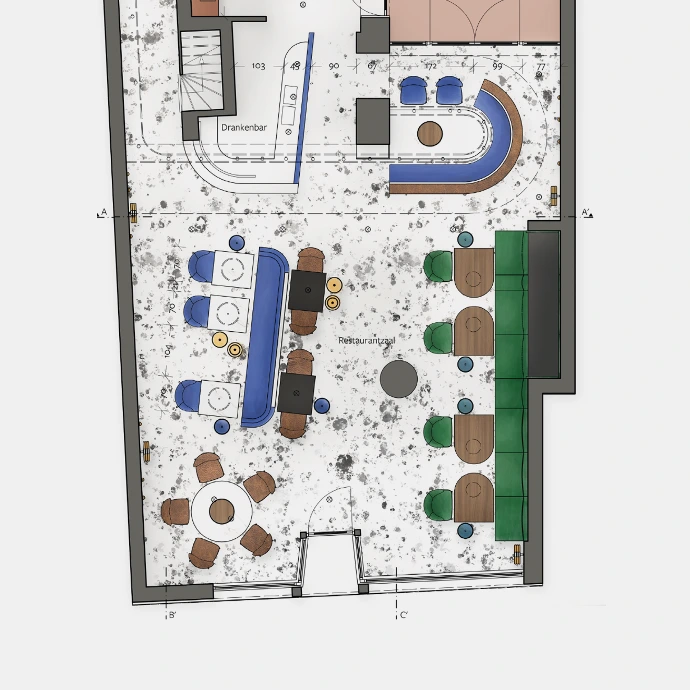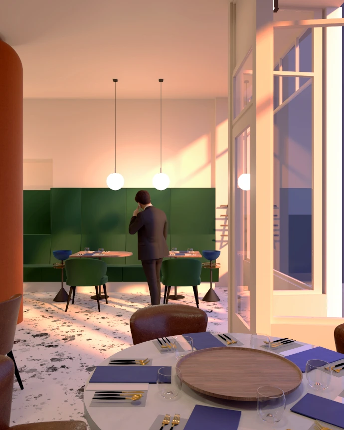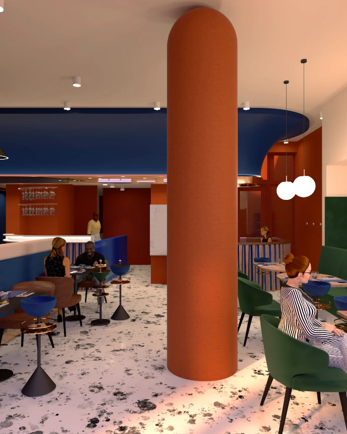 Een energieke vormentaal, gecombineerd met kleuren die verwijzen naar de warmte en rijkdom van de natuur, creëert een hippe, dynamische sfeer die experiment en verfijning moeiteloos met elkaar verzoent. Het interieur fungeert zo als een decor van verre bestemmingen, waarin gastheren en gastvrouwen de bezoekers begeleiden bij het samenstellen van een gastronomische reis die telkens opnieuw verrast.